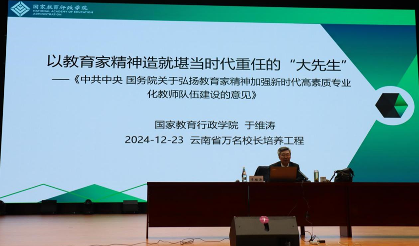 2024年12月23日上午,云南省第二轮“万名校长培训计划”第一期名家讲座第1讲在云南师范大学呈贡校区多功能实训中心开讲。国家教育行政学院于维涛教授以《以教育家精神造就堪当时代重任的“大先生”》为主题,为全体学员带来一场兼具理论深度与实践指导意义的专题讲座。