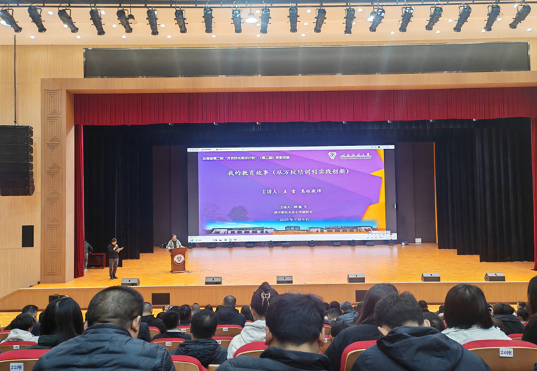 3月6日上午,云南省第二轮“万名校长培训计划”第二期名家讲座第二讲,在云南师范大学呈贡校区多功能实训中心开讲。本次讲座由昆明经开区实验小学王雷校长主讲,他以《我的教育故事(从万校培训到实践创新)》为主题,分享了自己参加第一轮“万名校长培训”时的学习心得,以及返岗后以教育家精神为引领,克服多重困难、成功运用培训所学开展实践的经历。