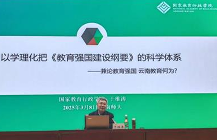 为深入贯彻《教育强国建设规划纲要(2024-2035年)》精神,推动云南教育高质量发展与教育强省建设深度融合,2025年3月8日上午,云南省第二轮“万名校长培训计划”第二期“名家讲座”第五讲在云南师范大学多功能报告厅顺利举行。国家教育行政学院于维涛教授应邀主讲,以《以学理化把<教育强国建设纲要>的科学体系—兼论教育强国,云南教育何为?》为题,为参训学员带来精准务实的专题分享。