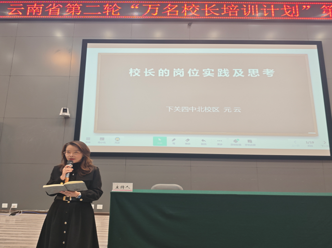 3月12日下午,云南省第二轮“万名校长培训计划”第二期“名家讲座”第九讲在云南师范大学呈贡校区顺利举行。大理下关四中北校区校长元云受邀作《校长的岗位实践及思考》专题分享,讲座由陆良一中蓉峰中学雍晴云老师主持。