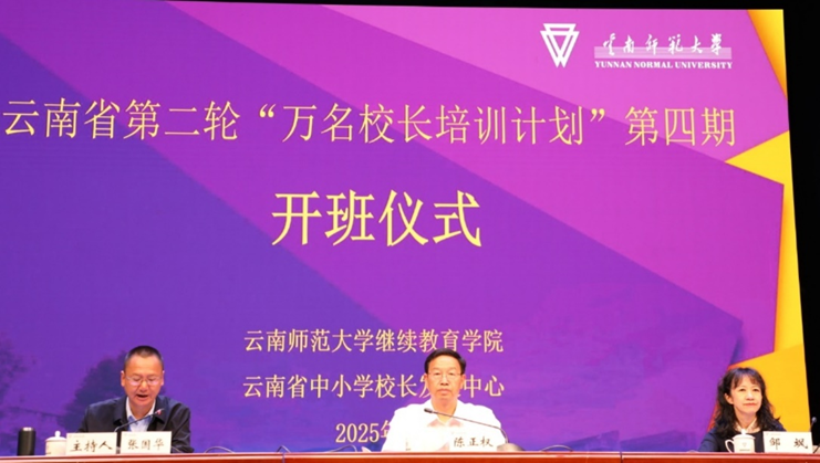 9月3日上午,云南省第二轮“万名校长培训计划”第四期开班仪式在我校艺术学院演播厅举行。云南师范大学副校长陈正权,继续教育学院党委书记邹飒、院长张国华、副院长聂彩仁,云南省中小学校长发展中心全体老师,以及来自全省16个州(市)433名中小学校(园)长参加开班式,开班式由张国华主持。本期培训采取“培训单位+培训基地校”的组织管理模式,按集中教学和观摩、线上教学、返岗实践、基地校跟岗研修四大模块组织实施。